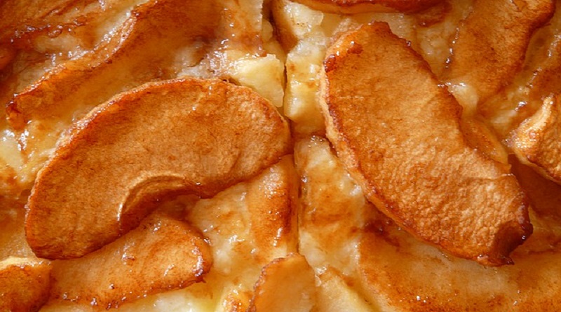 4. Pour the eggs over the apples and sultanas and let them sink in the fruit.