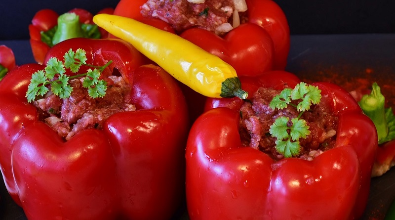 6. Spoon the cooked chicken and rice mixture into the peppers.