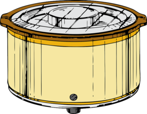 - Place chicken, 1 onion, tomato, carrot, and 2 cloves of garlic into crock pot.