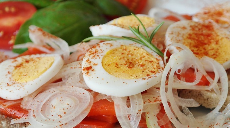 - Assemble the sandwich by placing the egg on the bread, then the tomato, then spring onion.