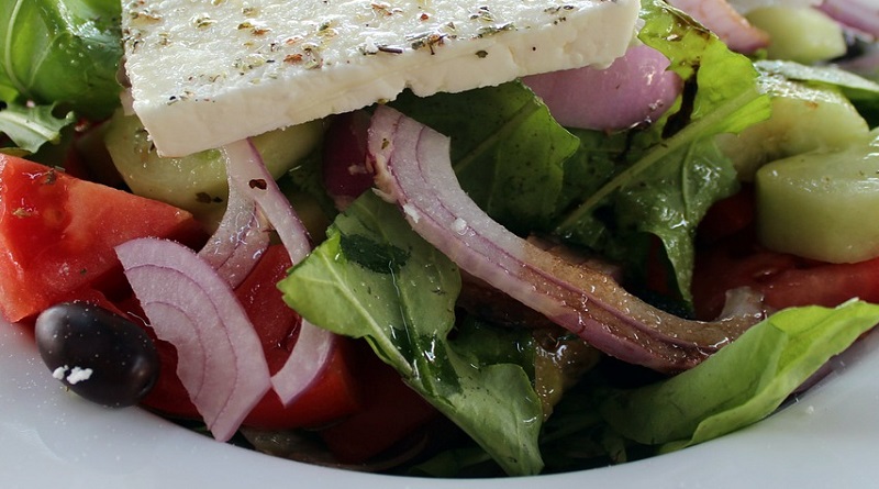 5. Top with lettuce, cucumber, tomatoes, and red onion; season with salt and pepper.